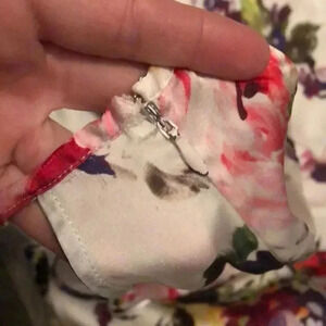 White floral crepe (100% Polyester). Sleeveless. Halter neckline. Maxi. Hidden back zipper with button closure. Partially lined. 37" from shoulder to shortest part of hem and 58" from shoulder to longest part of hem. Imported.