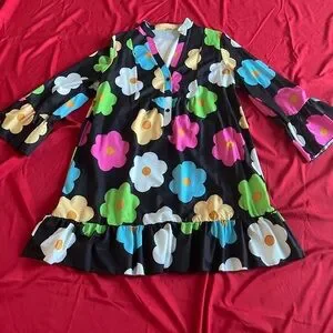 Bold A-line skirt with vibrant floral design. Features a mix of bright colors on a black background. Perfect for a standout look.