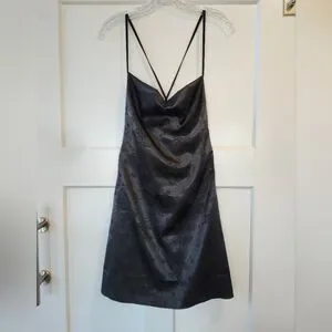 Chic black slip dress with a subtle floral pattern. Perfect for evening wear.