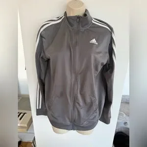 Adidas jacket in charcoal. Features iconic white stripes on sleeves. Zipper closure and logo detail.
