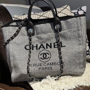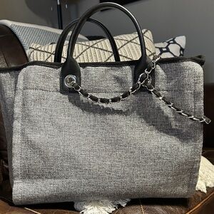 Stylish large grey tweed style tote with braided chain shoulder straps. Perfect for day to day use. Excellent condition. Not Authentic.
