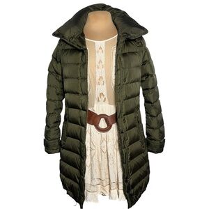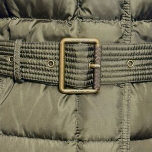 Authentic Burberry Brit quilted long down coat in a military or olive green color. The style features a high stand-up collar with a buckle closure, concealed snap and full-zip front, quilted construction, and zip pockets on the hips. Optional belt. Burberry brit logo stamps on all hardware, drawcords.