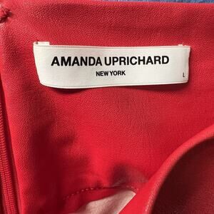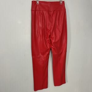 The Amanda Uprichard Red Faux Leather Romana Women's High Waisted Pants in size Large are a bold and stylish addition to any wardrobe. Made from faux leather with a solid red color, these cropped pants feature a high rise and flat front design.
