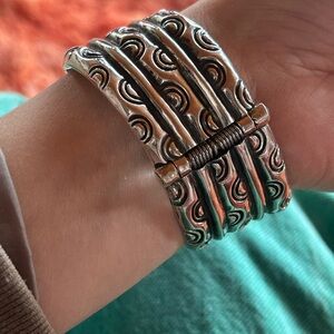 Hard to find unique vintage artisian, handmade. The hinges opens up so you can put it on your wrist. Very quality peace fits most adult wrists. Weighs about 90 grams