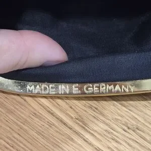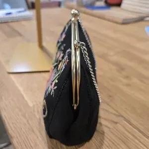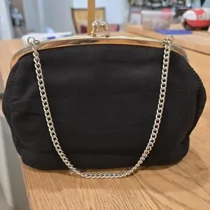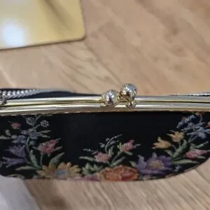 This vintage black evening bag features a floral needlepoint (or petit point) tapestry design and a gold-tone kiss-lock frame and chain handle. It has a small interior slip pocket and is stamped "Made In E. Germany". Bag is in very good condition for its age.