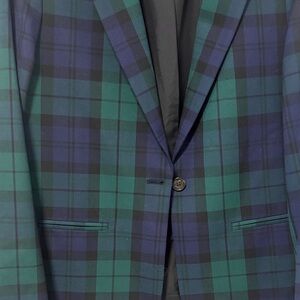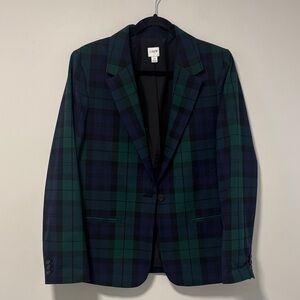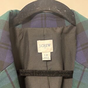 New without tags blazer from J.Crew. Purchased from the store and never wore it. Size 12. Pit to pit across the back approximately 21 inches. Navy blue and green plaid. Button closure, back slit, lined, pockets still sewn shut.