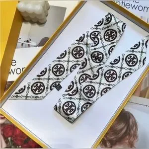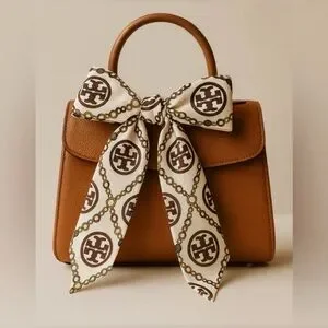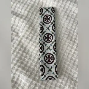 Add a pop of color and effortless luxury to your wardrobe with this stunning Tory Burch silk twilly. Featuring a vibrant background adorned with the iconic Tory Burch double-T medallion print in golden yellow and turquoise accents, this versatile accessory exudes chic sophistication. Crafted from smooth, lightweight silk, it’s perfect for styling in endless ways—tie it around your neck, wrap it around a handbag handle, wear it as a hair ribbon, or accent your wrist for a signature Tory touch.