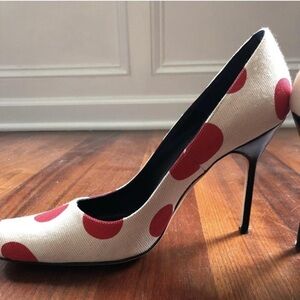 Elegant heels with bold red polka dots. Perfect for a stylish statement.