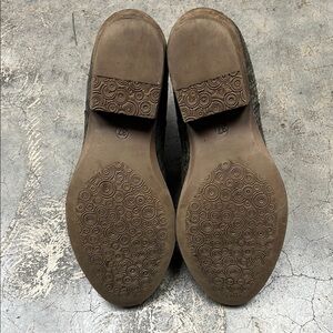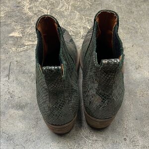 These Eric Michael ankle boots feature a striking snakeskin-like pattern in green and brown, offering a unique and exotic look. The Chelsea-style design ensures a snug fit with elastic side panels for easy wear. A low, stacked wooden heel adds a touch of contrast and elegance to the overall design.
