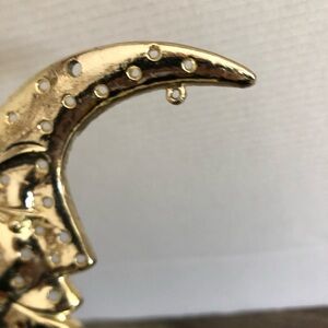 Elegant gold tone crescent moon earring stand with intricate details. Perfect for hanging and displaying earrings!