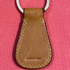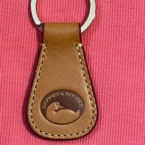 Sleek tan leather key holder by Dooney & Bourke. Features embossed logo and sturdy metal ring.