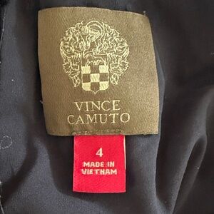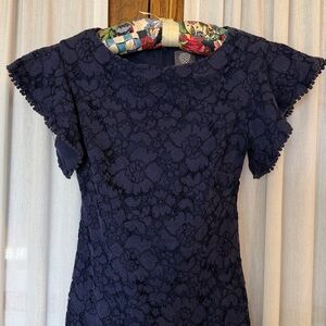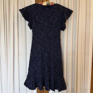 Vince Camuto Dark Blue Lace Flutter Sleeve Dress. Beautiful dark blue lace dress. Pullover style with concealed back zipper hook and eye close. Flutter sleeves and hemline with tiny ball trim. Fully lined. Good pre owned condition. Pet and smoke free home.