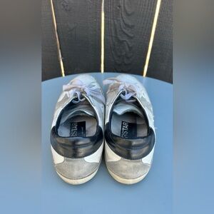 Stylish Golden Goose sneakers. White leather with gray star detail. Classic lace-up design.