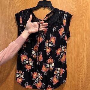 Chic black top with vibrant floral patterns. Sleeveless design. Ideal for casual outings.