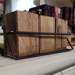 Stylish wooden organizer with a sturdy metal frame. Perfect for desk or home decor.