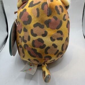 Charming Squishmallows plush with leopard print. Soft and cuddly with white accents.