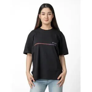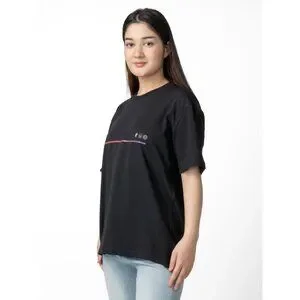 This black T-shirt is crafted from breathable cotton, boasting a minimalist graphic design for a sleek, modern touch suitable for casual or semi-casual wear.