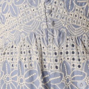 Charming lavender lace dress with puff sleeves. Features a deep V-neckline and floral patterns. Perfect for elegant outings.
