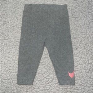 White onesie with pink and blue 'Just Do It' print. Gray pants with pink Nike logo.