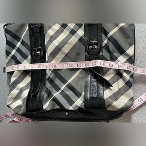 Nylon and patent leather trim. Gunmetal hardware. Inside Zipper pocket and two open slip pockets inside. Centre magnet closure.