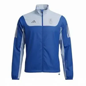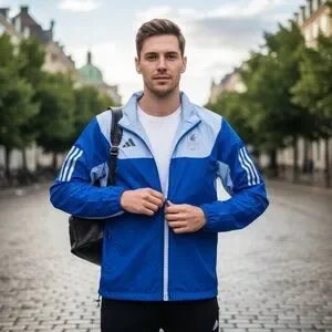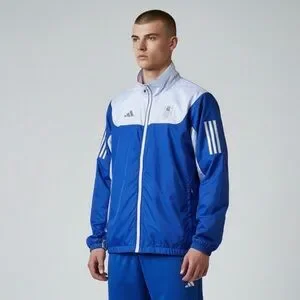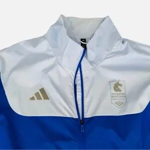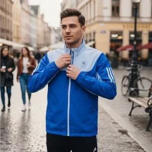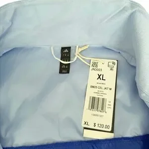 Elevate your look with this Adidas windbreaker. Bold blue and crisp white design. Perfect for active days.