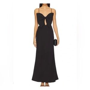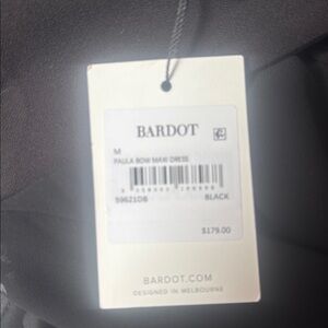 Chic black backless dress by Bardot. Features a bold bow accent. Ideal for elegant events.