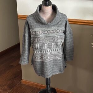 Elegant gray sweater with intricate patterns. Features a cozy cowl neck. Ideal for cool weather.