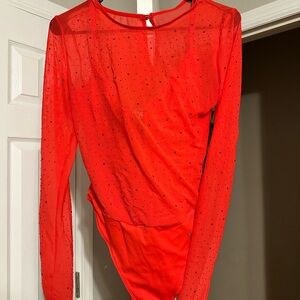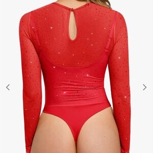 Turn heads with this glamorous red bodysuit, featuring sparkling details for a chic look. Perfect for a night out or special occasion.