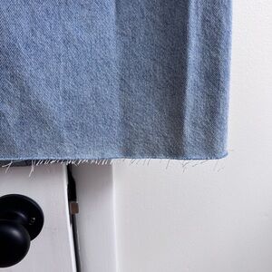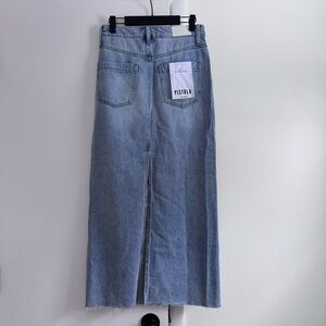 Denim maxi skirt. Button and zipper fly. Five pocket construction. Back slit. Raw edge hem. Unlined.
