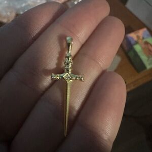 Elegant gold sword pendant necklace, perfect for adding a touch of sophistication to any outfit. Does not come with necklace only pendant. Super cute diamond pendent form awe inspired