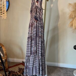 BRAND NEW Embrace a bohemian vibe with this stunning maxi dress. Featuring a mix of blue and purple patterns, it's perfect for any occasion.