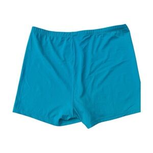 Tankini top with bike shorts. Vibrant teal and pink colors sure to make a splash this summer.