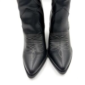 Black faux leather knee-high cowboy boots with a pointed toe and block heel. These Western-style boots showcase intricate stitching details along the shaft and vamp, adding a touch of classic cowboy flair. The sturdy block heel provides comfortable lift and stability, making them a versatile addition to any wardrobe.