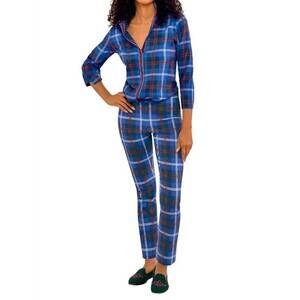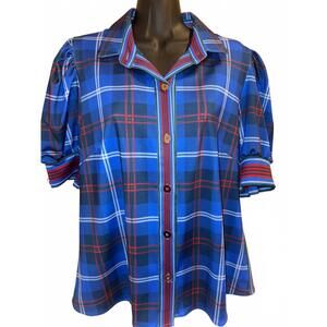 Introducing the Middleton Plaid Puff Sleeve Top Shirt by Gretchen Scott, a sophisticated addition to your collection with long puff sleeves and a stylish stand-up collar. Made from a cotton blend, this shirt features a vibrant plaid pattern in bright blue. Designed with a classic button closure, it's perfect for a preppy spring look. Care instructions include hand washing for optimal maintenance.