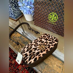 Stylish Tory Burch Britten convertible calfskin leather shoulder bag with bold leopard print. Features iconic Tory Burch logo. Perfect for a chic look. Authentic guaranteed!