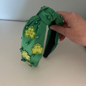 This vibrant green headband features playful shamrock designs, perfect for adding a touch of luck to any outfit.