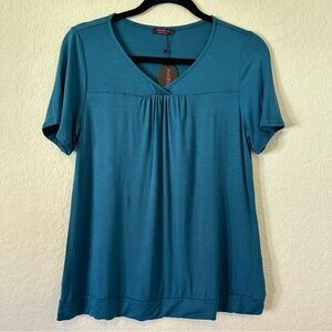 Cute, flowy little top from Avidlove with short sleeves and a v-neck neckline. In a pretty dark teal color with a line detail right under the neckline. Made of a rayon and spandex blend so the top has plenty of stretch to fit to the person wearing it. Size small, brand new with tags.
