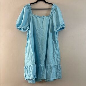 Beautiful Stoney Clover LN dress in a soft sky blue color, size 1X. Made from a breathable linen and rayon blend (55% linen / 45% rayon), perfect for warm weather. Features a romantic square neckline with ruffle trim, puff sleeves, full button-front, and a flowy babydoll silhouette with a ruffled hem. Lightweight, airy, and super flattering—great for spring, summer, vacations, brunch, beach days, and cottagecore or coquette aesthetics.