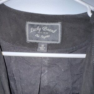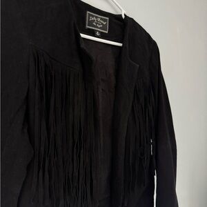 Stylish black blazer with fringe accents. Perfect for a chic, modern look.