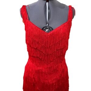 Vintage 80's Dovizia by Jane McCartney Red Fringe Tiered Flapper Dress. Excellent vintage condition. Zip back. Fully lined. Lining is V shaped and then there is 12" long fringe at the bottom of the dress. Fringed drop shoulders. There are also red shoulder straps so the dress stays put. Very wonderful flapper dress. Size 10, but PLEASE NOTE vintage size may run smaller. Please check measurements and see all pictures as they are also part of the description.