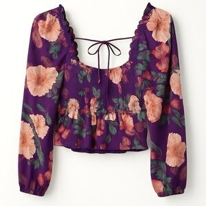 NWT Purple Floral Print Balloon Sleeve Crop Top Size Medium