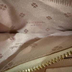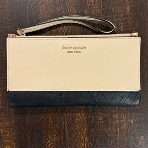 Elegant and versatile Kate Spade wristlet wallet in a chic beige and black color block design. Features gold foil logo, zip closure with wrist strap, and interior card slots with signature pink clover lining. Perfect for errands, travel, or a night out.