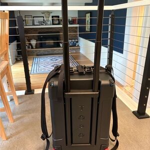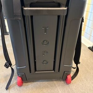 Stylish Topo Designs backpack with a checkered gray pattern. Features red accents for a bold look. Ideal for daily use. Small New Belgium logo on front