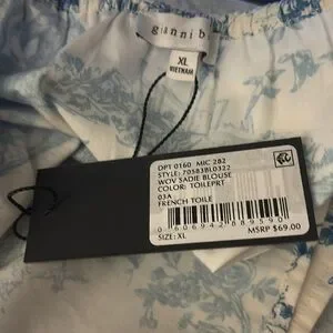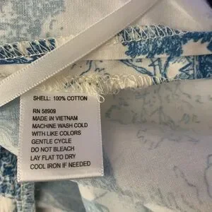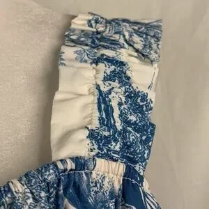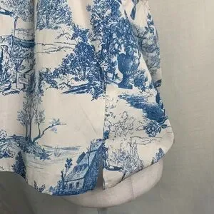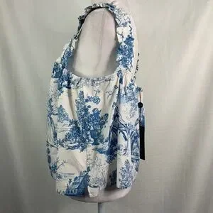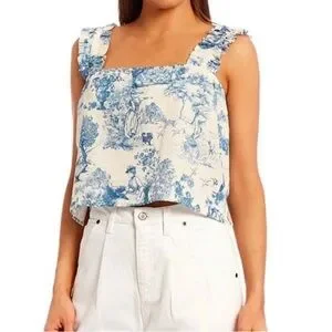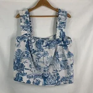 Beautiful billowy, semi cropped length, square neck sleeveless blouse. White backing with blue Victorian era print; super cute and comfy! Thick ruffled straps, bottom side vents. This would pair great with a pair of jeans or colored pant. Elastic at the bust and strap.