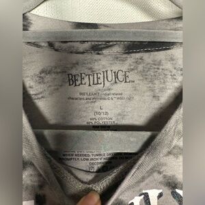Beetlejuice Black and Grey Tie Dye Sparkly Graphic Crop Top. Black and grey tie dye. Orange sparkly Beetlejuice graphic. Cropped t shirt style. Size Large.
