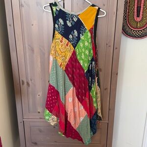 Worn twice patchwork dress. No size or material tags but likely viscose or rayon. Soft flowy material. Purchased from Inca imports. Very boho hippie style, hand stitched locally in peru. Pockets at hips. Comes from pet free smoke free home.