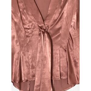 WAYF Women's Long Sleeve Satin Blouse. Rose gold. Long sleeve with button cuffs. Buttons down front with deep V-neck and tie front. Size Large