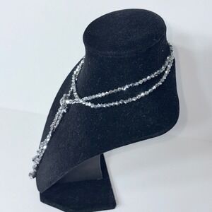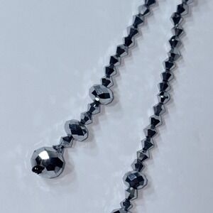 Keywords: lariat necklace, crystal beads, silver tone, faceted, Y necklace, drop pendant, glamorous, evening wear, formal accessory, statement necklace, fashion jewelry, dainty, chic