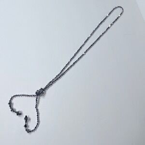 Sparkling crystal lariat necklace with a Y drop design if desired. Necklace is open ended so it can be designed how you desire. Features a double strand of faceted silver-tone beads leading to a central knot detail with dangling faceted beads. This elegant piece adds a touch of glamour perfect for a special evening out or as a sophisticated accessory for a formal event.