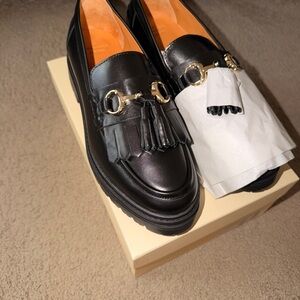 Elegant black loafers with gold detailing. Features tassel design. Perfect for versatile styling.